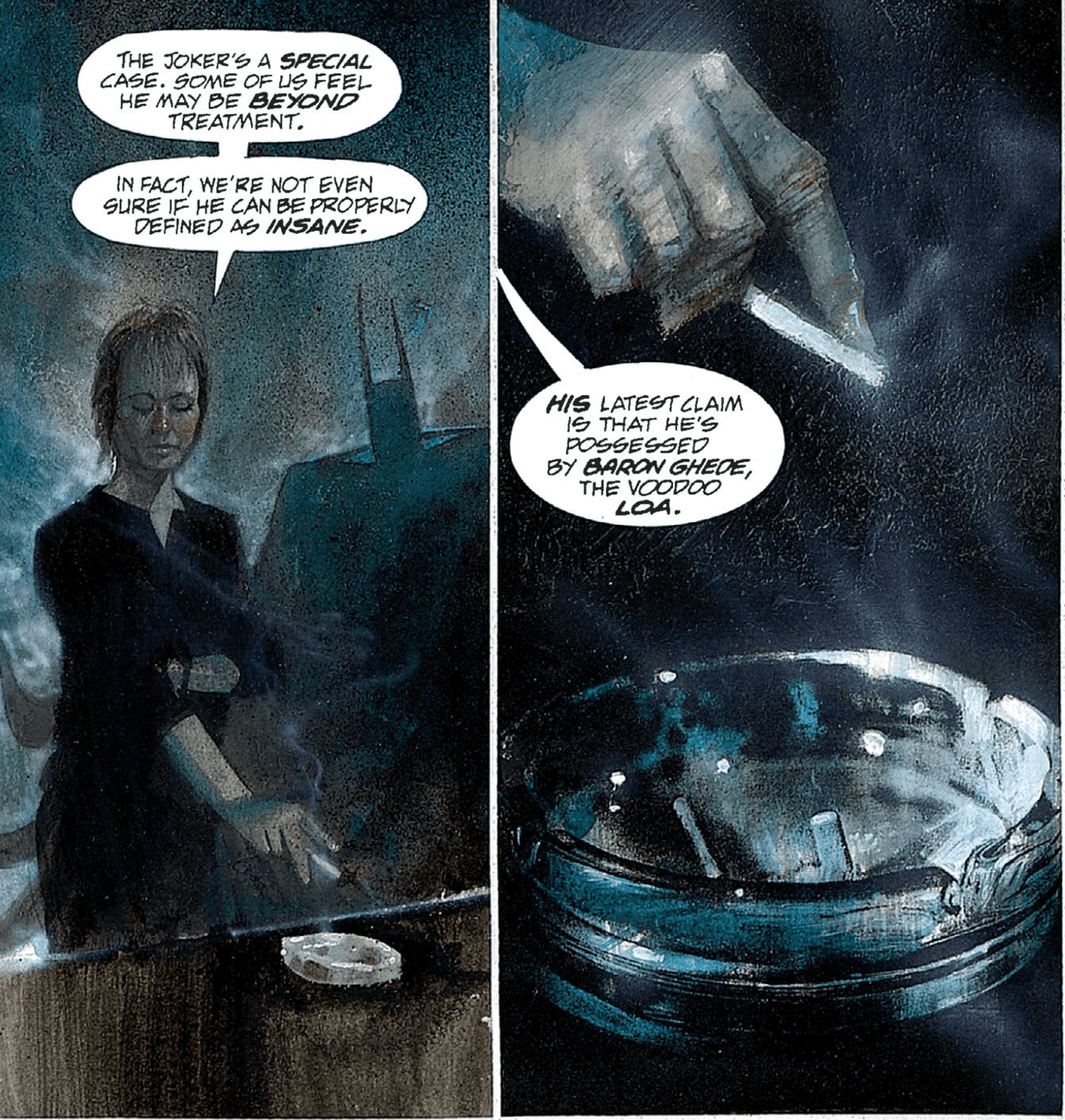 The Arkham Asylum has always been a centerpiece in the Batman mythology. While Batman relies on psychology to defeat villains, the city of Gotham relies on psychiatry to rehabilitate them. Joker, a prominent Batman enemy has always proven to be a most difficult patient to grasp. The reason why he became the Joker is one of the greatest secrets in the history of comic literature. In Batman: The Killing Joke, another story that delves into the psychology of the Joker, the Clown Prince of Crime himself confesses: "Sometimes I remember it one way, sometimes another... If I'm going to have a past, I prefer it to be multiple choice! Ha Ha Ha." To explain his insanity, Joker apparently tells his psychotherapist that he is possessed by the Haitian Vodou Lwa, Bawon Samdi. In Vodou, because possession is not easy to attain, initiates have to work hard to achieve a sense of mental clarity and spirituality in order to be receptive to a Lwa. So the Joker is basically claiming that he is a Vodou practitioner. While Baron and Joker certainly have the white face, the nasal tone, the purple color and the cult of death in common, I'm as skeptical of this claim as any other the Joker makes about "how he got his scars." However, as far as multiple choice questions go, the answer may simply be: "all of the above" when it comes to Joker.