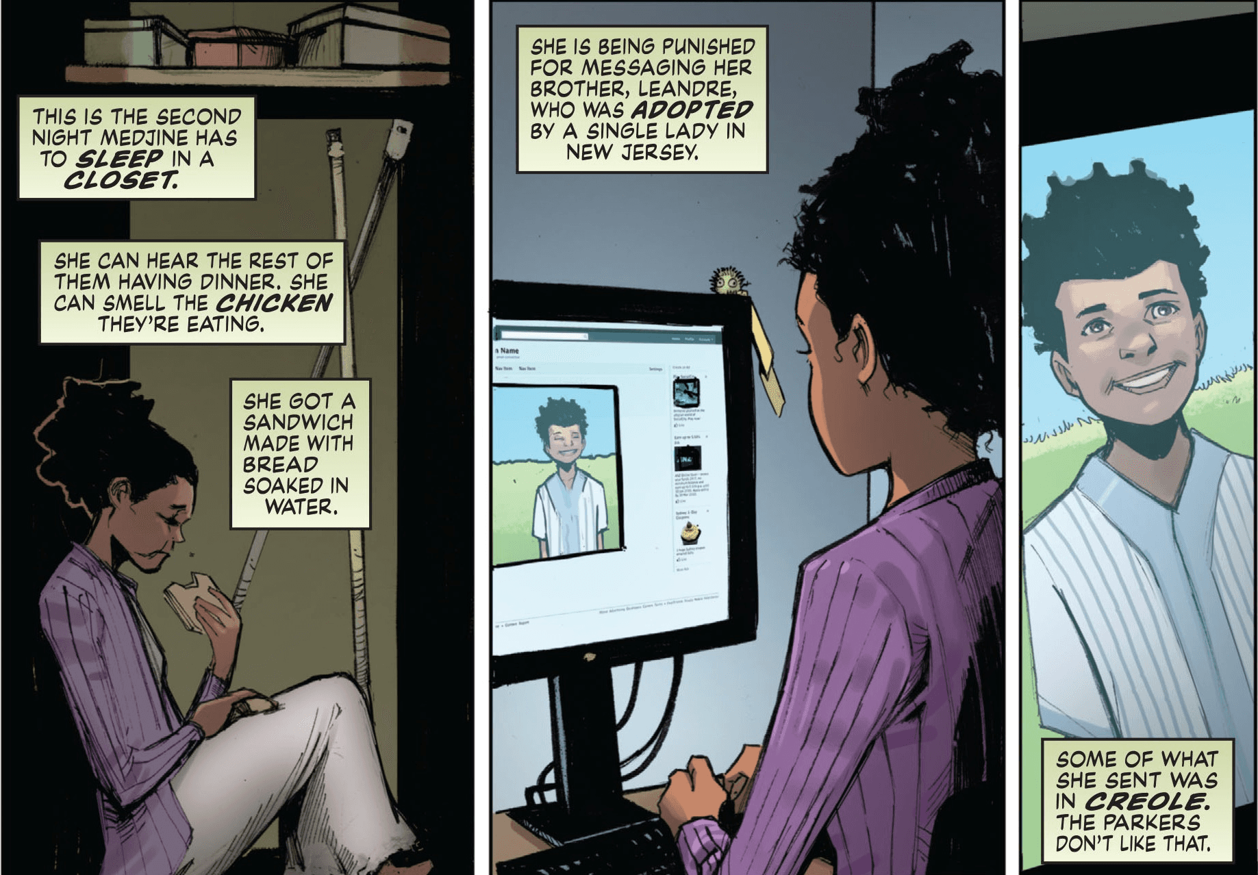Medjine is constantly punished by her adoptive parents, just for being Medjine.
