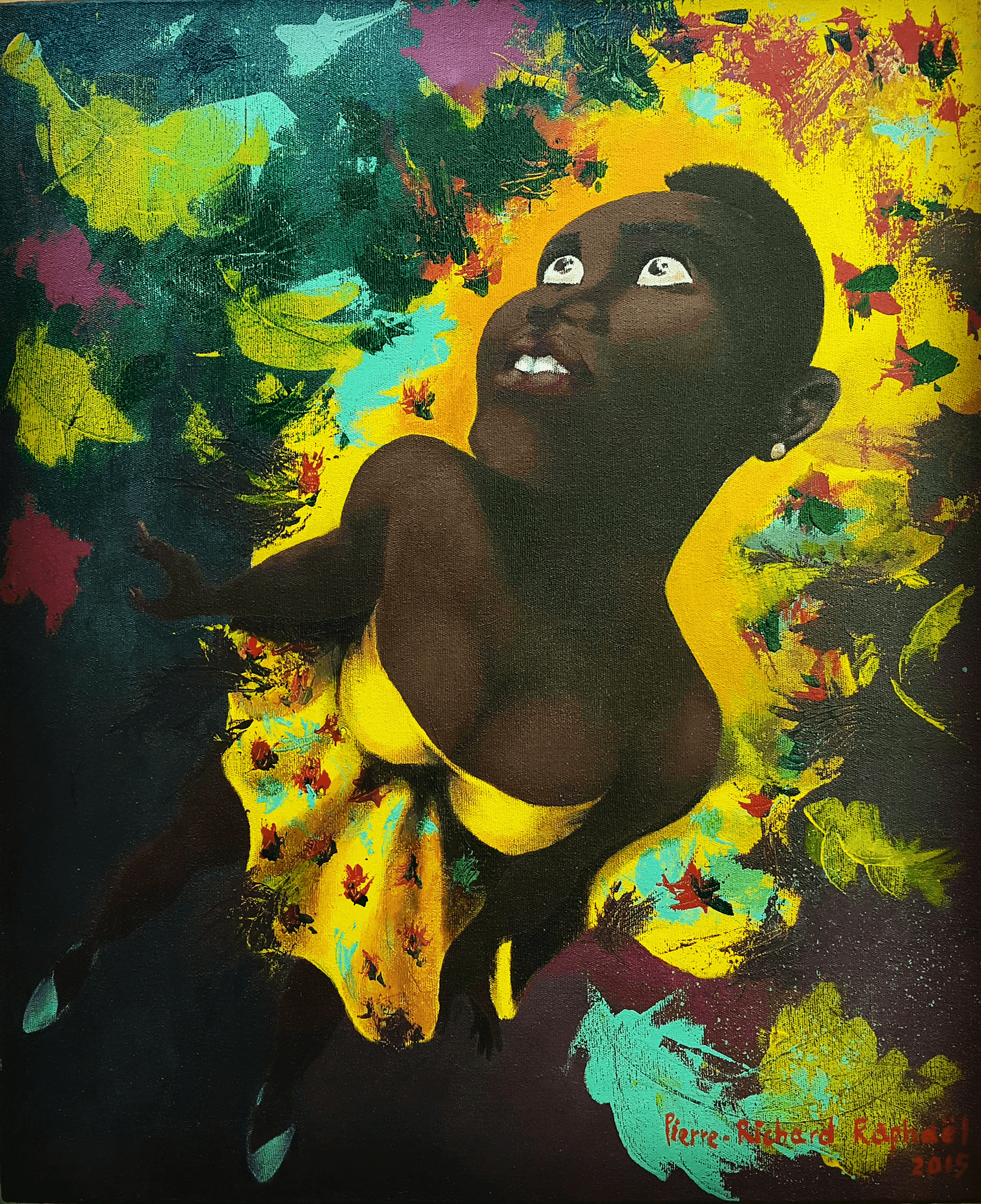 One afternoon, the light on my phone went off, I smiled because it reminded me of the days of Blackberry craze. This time, however, it was a whatsapp instead of a BBM from a good friend of mine inviting me to attend an art show at Yanvalou. In the days leading up to the event, I was very excited because I could not wait to see what the ENARTS students would showcase. On the day of the event, in a corner, three paintings by Pierre Richard Raphaël enthralled my father and I and made me exclaim: "I want that painting! No, I need that painting!!" I found not only his imagination, but also his technique, his use of color and the complexity of his work intrigued me.