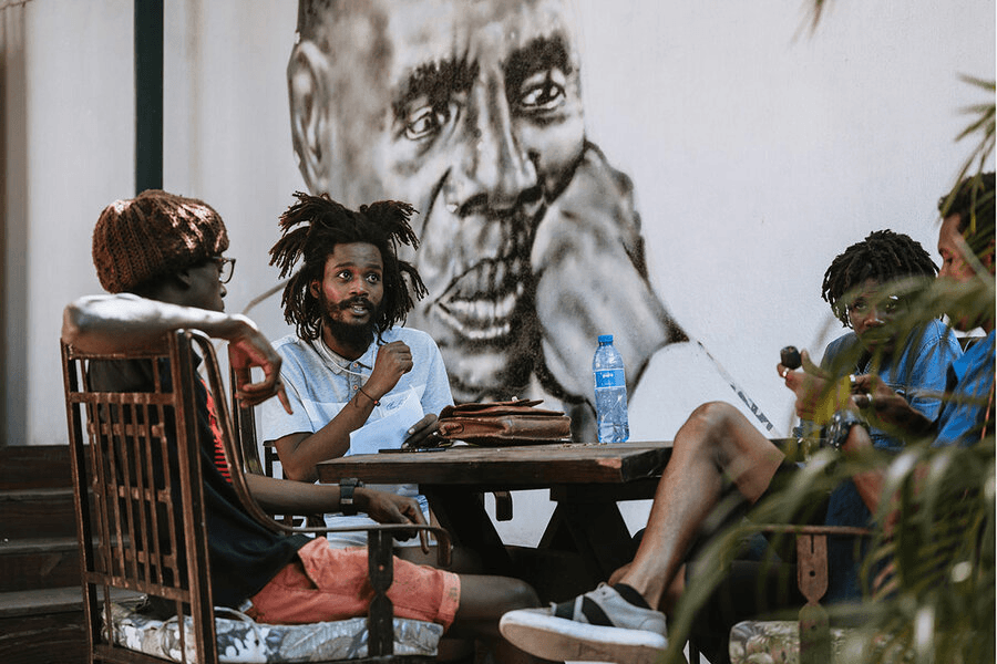 Theatergoers talk after an event at the Yanvalou Café in Port-au-Prince, Haiti. The Quatre Chemins theater festival brings audiences together with Haitian playwrights, actors, and dance companies for readings, staged productions, and street performances.
